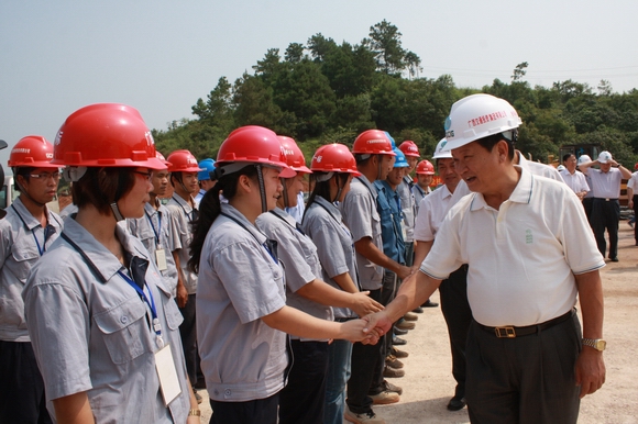 自治區(qū)黨委常委、南寧市市委書記車榮福與六欽1標(biāo)廣西路橋建設(shè)者親切握手