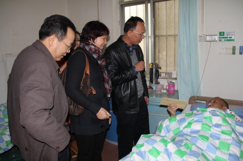 集團(tuán)公司總經(jīng)理李定倫(左三)和總工程師覃炳賢(左一)慰問(wèn)生病住院的老黨員何家福同志