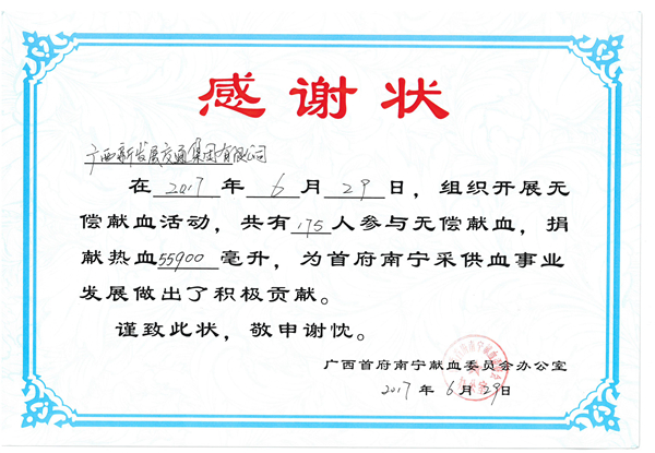 南寧獻(xiàn)血管理委員會充分肯定了新發(fā)展交通集團(tuán)黨員群眾踴躍參與獻(xiàn)血,積極投身公益事業(yè)的行為,并向集團(tuán)公司贈送了感謝狀。