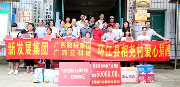8月18日,廣西新發(fā)展交通集團(tuán)到環(huán)江縣明倫鎮(zhèn)相堯村開(kāi)展愛(ài)心助學(xué)金和產(chǎn)業(yè)發(fā)展基金捐贈(zèng)活動(dòng),向相堯村貧困學(xué)子捐贈(zèng)文體用品、學(xué)習(xí)用具、愛(ài)心款,資助相堯村稻田養(yǎng)魚(yú)特色產(chǎn)業(yè)。