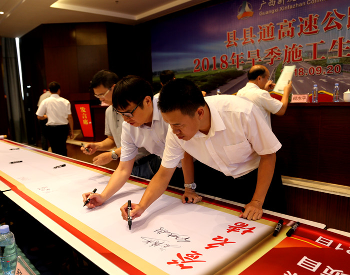 會(huì)上,與會(huì)領(lǐng)導(dǎo)為各參建單位代表授“黨員先鋒隊(duì)”及“青年突擊隊(duì)”旗子。會(huì)上還開(kāi)展了旱季施工質(zhì)量安全承諾簽字活動(dòng)。