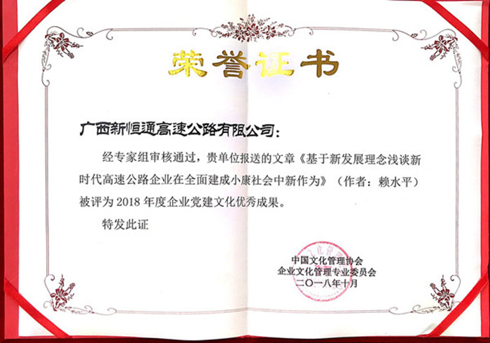 會(huì)上,由賴水平撰寫的文章《基于新發(fā)展理念淺談新時(shí)代高速公路企業(yè)在全面建成小康社會(huì)中新作為》在企業(yè)黨建文化優(yōu)秀成果評(píng)比中,被評(píng)為2018年度企業(yè)黨建文化優(yōu)秀成果;由新恒通公司都巴指揮部創(chuàng)作團(tuán)隊(duì)拍攝的《遷動(dòng)人心》微電影榮獲“最美企業(yè)之聲”代言作品榮譽(yù)稱號(hào)。